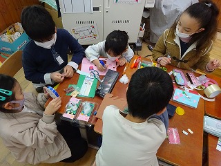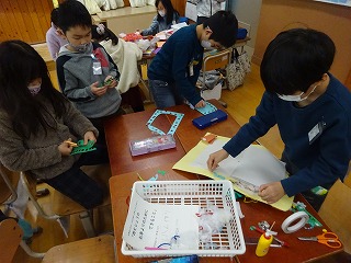 先週に引き続き、地域の高齢者福祉施設の利用者のためにプレゼントづくりを進めました。グループごとに利用者の姿を思い浮かべながら、グループで話し合って丁寧に作っています。一人一人の思いや考えがつまったすてきなプレゼントが完成しました。