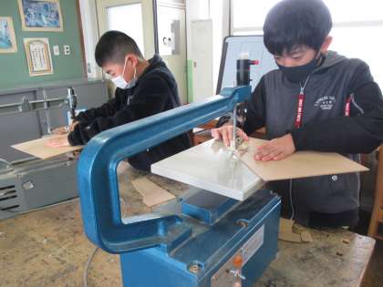 電動糸のこぎりを初めて使いましたが、直線や曲線を上手に切ることができていました。どんな作品ができあがるか、とても楽しみです。