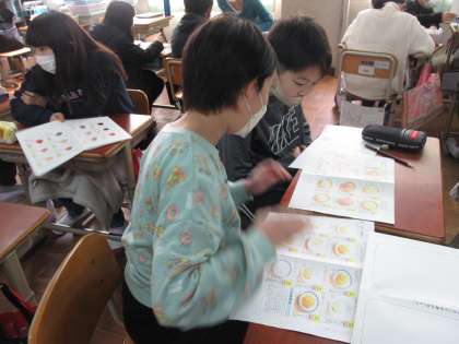 提示された資料から、塩分量の多い調味料を探したり、みんなの大好きなラーメンを例にとって、どのような減塩の工夫ができそうかグループで話し合ったりしました。「味付けをいろいろ工夫して塩分を減らす。」「ラーメンのスープはすべて飲まないようにする。」「買うときには、塩分量をチェックして買う。」「出汁をしっかりととっておいしくする。」「具だくさんにする。」「加工品はなるべく使わない。」などの意見が出ました。