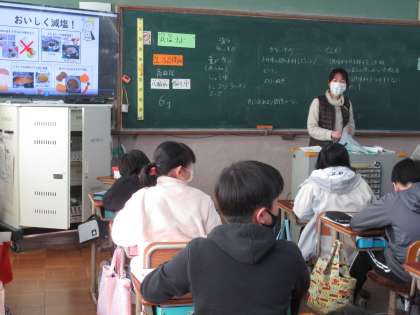 今日は、栄養教諭による「減塩チャレンジ大作戦! 塩分をとりすぎない工夫を考えよう」という授業を行いました。