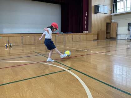 今日の体育では、「ボールけりゲーム」の学習を行いました。ドリブル練習から始まり、パス練習、シュート練習を行いました。それぞれの練習では、低学年と6年生で二人組を作り、6年生が上手に指導していました。低学年の子どもたちも指導を素直に聞き、取り組んでいました。今後の上達が楽しみです。