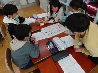 食の指導の一環で栄養教諭の先生と一緒に元気スイッチが入る朝ごはんについて考えました。なぜ朝ごはんを食べるのか、どんなものを食べるとよいのなど、これまでの生活を振り返りながら班で話し合って考えました。
