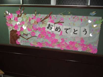 今日の活動時間に子どもたちが仕上げてくれたお祝い掲示は、西階段の踊り場に掲示しています。