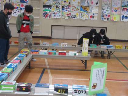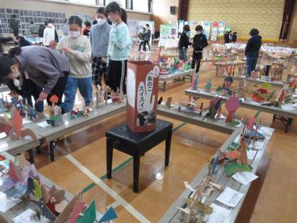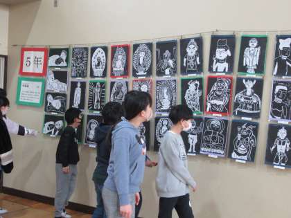 昨日・今日と、体育館にて図工展を行いました。5年生は、仏像をテーマにした木版画と、糸のこぎりで切った板を組み合わせた立体作品を展示しました。今日は、体育館で作品を鑑賞しました。低学年の頃に取り組んだ懐かしい作品や、来年取り組むかもしれない6年生の作品など、多くの作品に見入っていました。どの作品にも、それぞれのよさがあり、とてもすてきでした。
