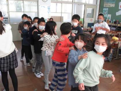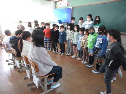 今年度、最後のたてわり活動では、1年間リードしてくれた6年生に感謝の思いを込めて5年生が企画・進行をしました。「20のとびら」や「じゃんけん列車」のゲームをしたあとに、これまでリードしてくれた6年生に感謝の思いを伝えました。