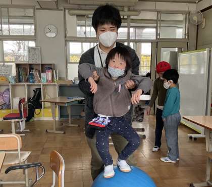 さくら学級には休み時間に教職員が子どもたちの様子を見に来てくれることがあります。写真は教職員と子どもと遊んでくれている様子です。このように担任以外の教職員も子どもたちと関係を築いてくれます。