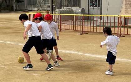 今日の体育はボールけりゲームです。よく晴れた外で体を動かすことができ、子どもたちも気持ちよさそうでした。