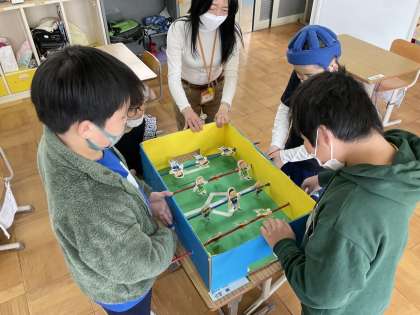 今日の算数の学習では、お楽しみ会で作ったテーブルサッカーゲームで数を数えようの学習をしました。