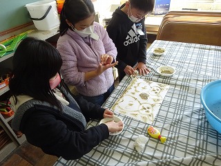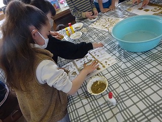 図工では土の絵の具を作って、画用紙に絵に表して作品づくりをしました。ボンドや洗濯のりと土の量を調整しながら、ちょうどいい土の絵の具を作ることに苦労している様子もみられましたが、準備から片付けまで、自分たちできちんとやりきることができました。さすが3年生、1年間の成長を感じられました。