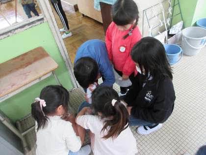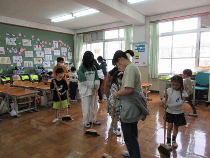 ほうきの掃き方・雑巾の絞り方など上級生として低い目線になって優しく丁寧に教えている姿が頼もしいです。