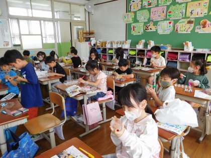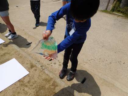図画工作科で「ひかりのプレゼント」という学習をしました。光をとおすものに色や模様をつけて、見え方を考えたり、映すことを楽しんだりしました。子どもたちは、友だちと材料を重ねたり、積んだりすることで、色や形が重なり合うことに気付きました。「うわぁ、きれいだなぁ。」「うっとりするなぁ。」そのような言葉がたくさん聞かれた1時間でした。カラーペンや材料の準備にご協力くださり、ありがとうございました。