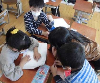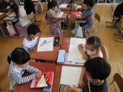 国語科「きつつきの商売」の学習では、1・2場面の内容を読み取り、自分たちで3場面を考えました。モモンガが出てきたり、さくらの木の音を売ったり、きつつきのすてきな音のおかげで喧嘩していた兄弟が仲直りしたりと、いろんなお話を考えていました。交流の中では、友だちの考えたお話を聞いて、感想を言ったり、こんなつけたしをしたら面白くなるのではないかと提案したりしていました。