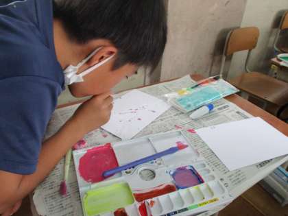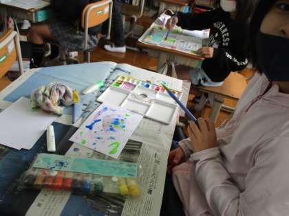 4年生になって初めての図画工作の学習でした。ビー玉に絵の具をつけて転がしてみたり、スパッタリングをしたりといろいろな方法を試しました。様々な模様ができるのを見て楽しみながら表現することができました。
