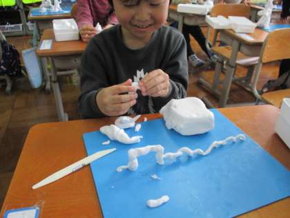 粘土の学習をしました。粘土を手で転がして、いろいろな長さ・太さのひもを作り、それらを組み合わせて思いつくものをどんどん作っていきました。「橋ができたよ!」「ソフトクリームの形になったよ。」と次々に形を作り変えて楽しみました。