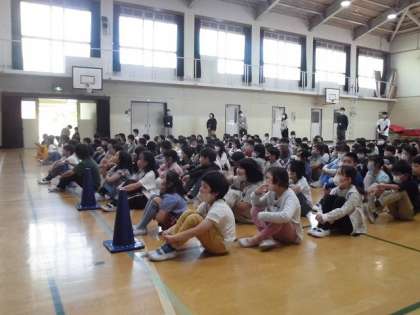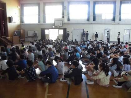5月の朝会を行いました。新型コロナウイルス感染対策のため、昨年度も一昨年度もオンラインでの朝会を行っていたため、3年生にとっては、入学して初めての体育館で参加する朝会でした。まっすぐ整列し、静かに座って校長先生のお話を聞くことができていました。