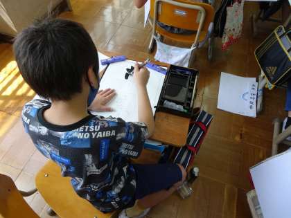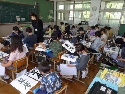 書写の授業で「草原」という字を書きました。最初に文字の組み立て方や、筆順を確認したあと、手本を見ながら、始筆と終筆を意識して、集中して書きました。1枚書き終えると「ふぅ。」と深呼吸する姿も見られ、一画一画気持ちをこめて書くことができました。