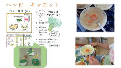 コーンのクリームシチューで、ハッピーキャロット(星型のにんじんを入れる)を実施しました。星型の人参が当たった児童には、調理員さん手作りのかしわもちをイメージしたしおりをプレゼントしました。1年生の児童は、もらったしおりを大切にそうにランドセルにつけてくれていました。にんじんがでるたびに「今日はハッピーキャロット?」と聞いてくれる児童もいます。楽しみながら給食を食べてほしいです。