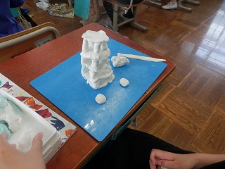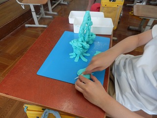 図画工作科「立ち上がれ!ねん土」の学習では、粘土を丸めたり、細長くしたりしたものを組み合わせて、タワーやオリジナルの生き物を作りました。子どもたちは粘土に模様をつけて工夫し、楽しみながら活動しました。