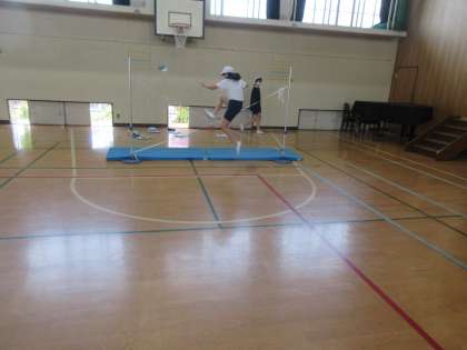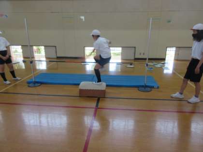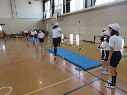 走り高跳びの学習では、自分の目標記録を決め、高く美しく跳ぶことを目指しています。「ゴムの場」「とび箱の場」などの練習の場を自分で選び、自分に必要な練習を繰り返し、身に着けようと頑張っています。