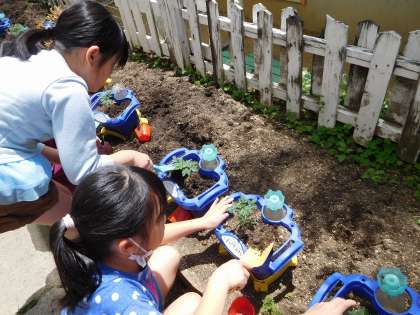 今日は、ミニトマトの苗を自分の植木鉢に植えました。