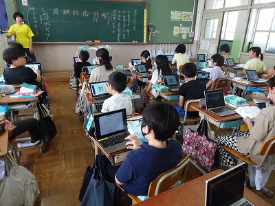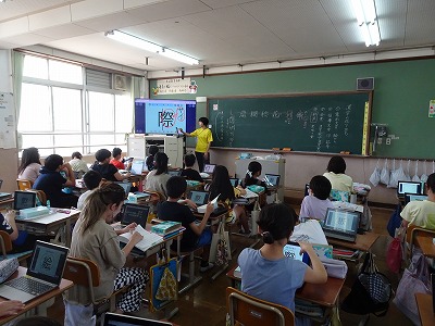 国語科では、「漢字の成り立ち」について学習しています。タブレットを使って「音を表す部分」はどこかなどを確かめました。色分けされてわかりやすいですね。