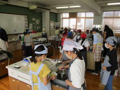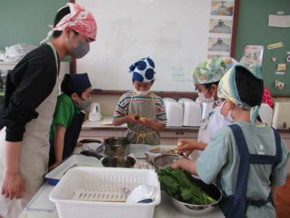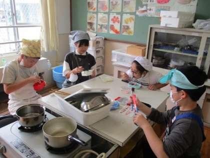 家庭科の学習では、5年生で初めての「ゆでる調理」を行いました。水からゆでる食材、お湯からゆでる食材があることを知り、ゆでた後にどのように変化しているかを観察しました。どのグループも協力しておいしくゆでることができました。