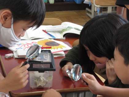 この日の理科の学習では、チョウの体のつくりを観察しました。放課後には、たくさんのチョウが元気に空に飛び立っていきました。校庭のキャベツ畑に戻ってくるチョウもいました。「実家に帰ってきたのかな…。」子どもたちの、とてもかわいく微笑ましい発言がありました。