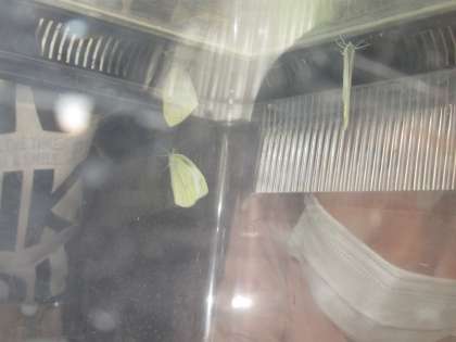 今週の火曜、学校に来てみると、さなぎの状態だったモンシロチョウが羽化して、成虫になっていました。休み時間に見てみると…、また成虫が増えていました。「また、チョウになっているよ。すごい。」と、子どもたちは大喜び。