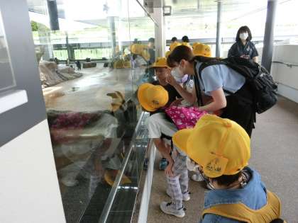 25日(木)、2年生1組・2組・3組・さくら学級で京都市水族館に社会見学に行きました。暑い中、一生懸命に歩いて梅小路公園に到着した子どもたちは、水族館の中では目を輝かせて水の生き物を観察しました。グループの友達と手をつないで仲良く見学する姿がとても微笑ましかったです。お弁当もととてもおいしかったようです。