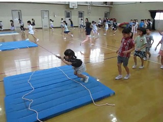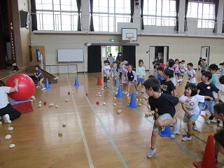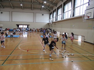 今日のチャレンジタイムは、体育館で「跳ぶ」「投げる」動きを入れたサーキット運動をしました。ケンステップで細かく跳んだり、川渡りで立ち幅跳びの動きで跳ぶ動きをしたりして、その先にあるバランスボールに向かって紅白玉を投げるコースで体を動かしました。