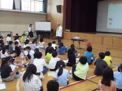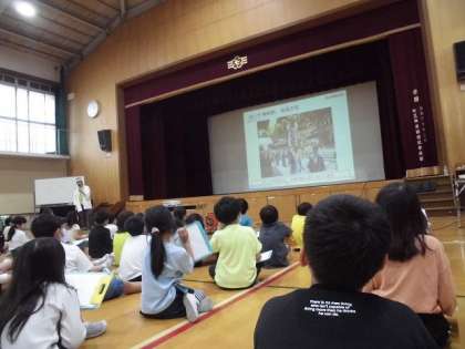 子どもたちはとても意欲的にお話を聞きました。また、お話の後には、「何人くらいで担ぐのですか。」「御旅所から松尾大社までどれくらいの時間がかかるのですか。」などとたくさんの質問をしました。