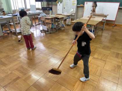 低学年の子どもたちの掃除の様子です。ほうきをしっかりと握って掃き掃除することができています。こうした様子から成長を感じることができます。