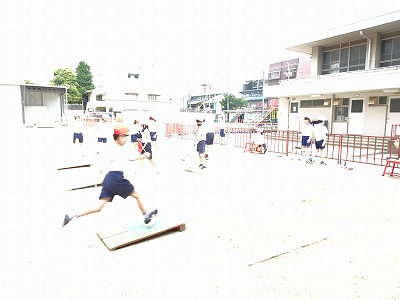 体育科では、走り幅跳びをしています。踏み切るまでに加速していくことや、ばんざいをして跳ぶことなど、自分でめあてをたてて頑張っています。