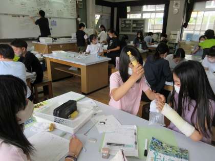 「人は空気を吸ったり吐いたりするとき、何を取り入れ何を出しているのだろうか」という問いのもと、実験をして学習しています。