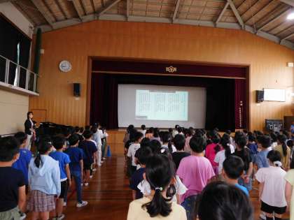 オンラインではなく、体育館に集まってお話がきけることを2年生は楽しみにしていました。