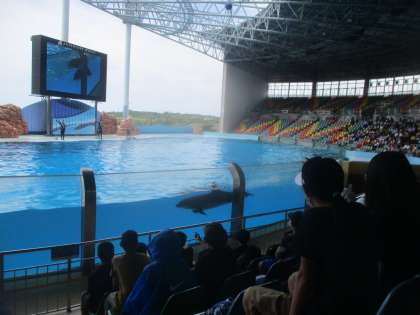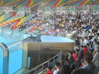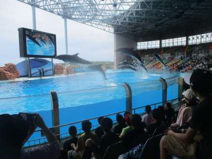 イルカショーでは、モニターに映ると手を振ったり、イルカの動きに拍手喝采したりと、