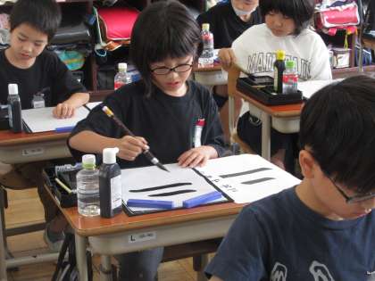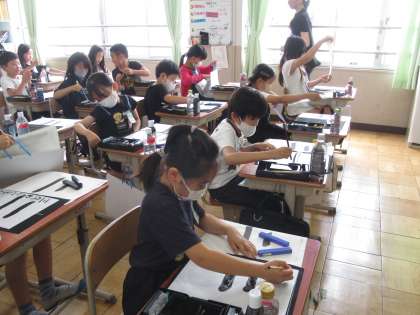 今週は、2回目の毛筆の学習に取り組みました。筆の持ち方や姿勢、始筆・終筆など筆づかいに気を付けて、手本を見ながら丁寧に書きました。