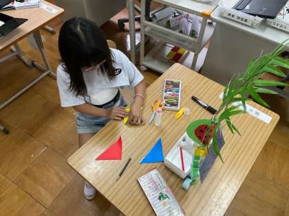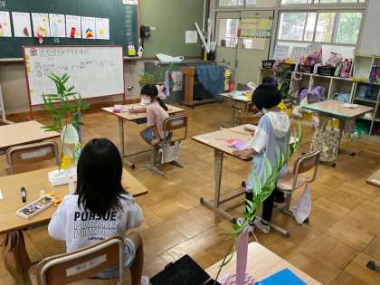 今回の図画工作の学習では、季節行事「七夕」の飾りを作りました。七夕の昔話を聞き、輪飾り、提灯などの様々な飾りと、自分の願い事を書いた短冊を笹に付け、季節を感じることができました。