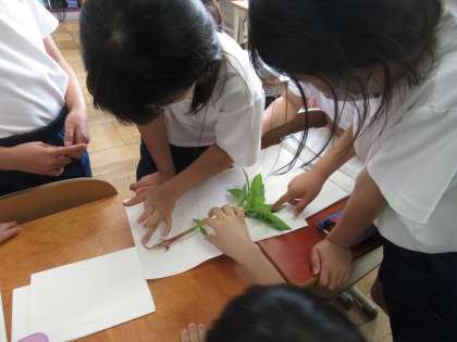 先週はこん虫の体のつくりについて学習しましたが、植物の体のつくりについても学習しました。花壇で育てているホウセンカとヒマワリの身体検査をして、普段は見ることのできない土の中の部分についても、じっくりと観察をしました。植物の体は、葉・くき・根でできていることが分かりました。
