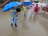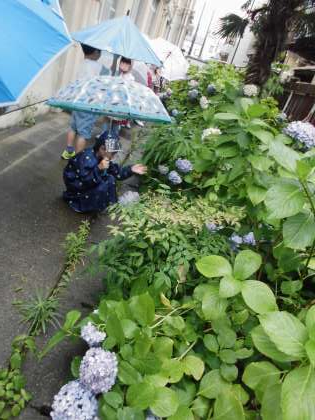 今週、雨の日の様子を見に校内をお散歩しました。木に滴る水滴や、水たまり、いろんなものを発見し楽しく過ごしました。