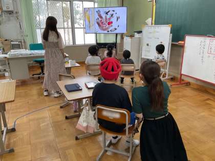 国語の学習では「さるかに合戦」のお話を聞いて、登場人物やその人柄について話し合いました。また授業の最後にはお話の感想を発表し、「おもしろかった」「スッとした」といった意見が出てきました。