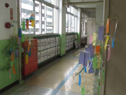 3年生の教室前の廊下にも、七夕の笹を飾っています。それぞれのクラスの子どもたちがかいた短冊には、自分のことや家族のこと・学校のことなど、さまざまな願い事がかかれています。