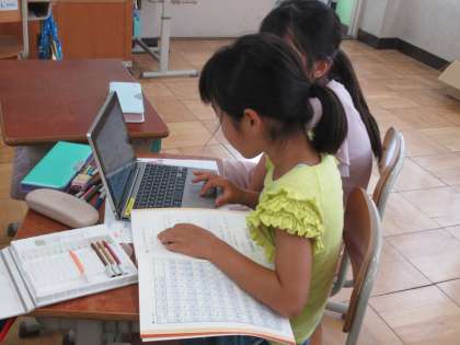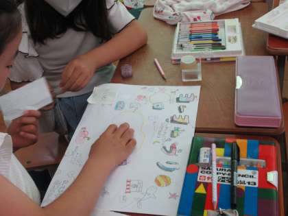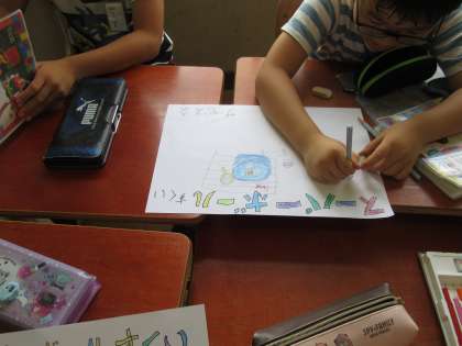 7月15日(土)に七条通りの商店街(七条中央サービス会)で行われるサマーナイトフェスティバルで、夜店ボランティアとして3年生が参加する予定なのですが、「お店の看板を作ろうか。」「お祭りの宣伝のために、学校の中でチラシを配ったりポスターを貼ったりしてはどうかな。」「ほかに、自分たちにできることはないかな…。」と、友だちと話し合いながら、生き生きと活動をしています。