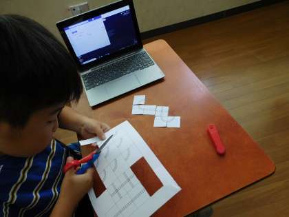 直線、カーブ、十字といった線路カードを使って、ぐるっと回れる線路づくりに取り組みました。