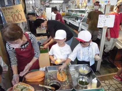 少し緊張しながら、でも、とても楽しそうに店番や接客をする様子が見られました。3年生は体育の服装でボランティア活動をしたのですが、左胸には、「明るくあいさつ」「ていねいに仕事をする」「みんなによろこんでもらえるように」「笑顔でせっ客」など、一人一人が考えた仕事に対するモットー(当日のめあて)を書いた名札をつけて活動をしました。