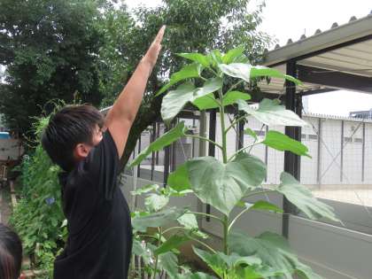 一番大きなヒマワリは、ついにみんなの身長をこえました。1週間前に紙テープで測った背丈と比べると、30cmほど背丈が伸びていました。計算してみると、1日で5cmほど伸びていることに…! みんな、感嘆の声をもらしていました。