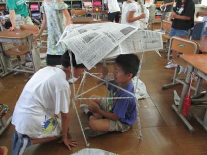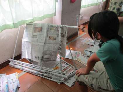 丸めた新聞紙でお家を作ったり、