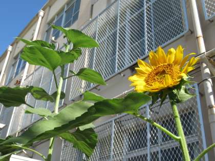 夏休みに入りました。梅雨明けとともに本格的な暑さの到来ですが、元気に毎日をお過ごしでしょうか。先週、茎の先端につぼみができていたヒマワリですが、今週に入って黄色い花が咲きました。太陽の方を向いて、元気いっぱいに咲いています。