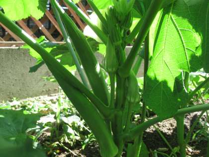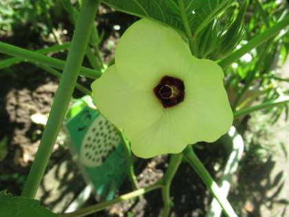 校舎裏の花壇でも変化が見られました。オクラにも黄色い花が咲きました。花が枯れたあとには、オクラの実ができていました。