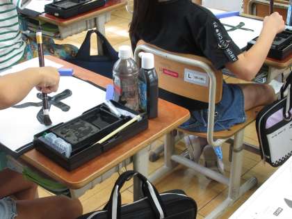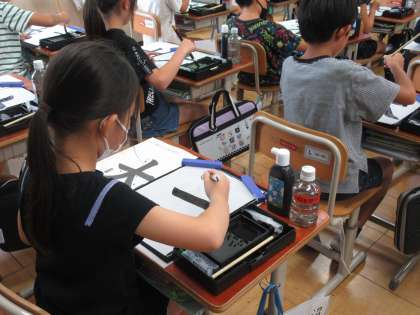 二学期になって初めての書写の時間、今回は「はらいの筆づかい」の練習に取り組みました。今までは、「二」「土」のように、縦画・横画でできている文字を書いてきましたが、今回は、左はらい・右はらいの両方がある「大」という文字に挑戦しました。